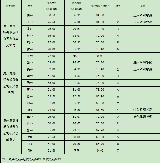 根據(jù)《貴州人才博覽會“職引前程點亮未來”高校畢業(yè)生專場招聘暨“國聘行動”貴州專場活動-貴州貴財招標有限責(zé)任公司招聘公告》,通過資格審查、筆試、面試環(huán)節(jié),經(jīng)公司黨委研究,現(xiàn)將最終成績及進入組織考察人員公告如下。